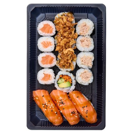 3 sushi saumon, 4 california surimi mayonnaise oignons frits, 4 maki saumon, 4 maki fromage ciboulette