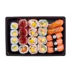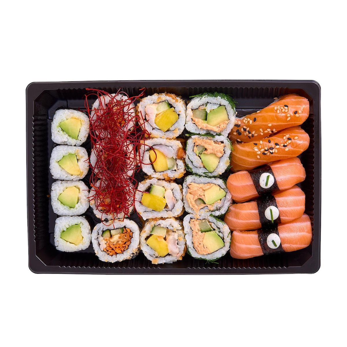 3 sushi saumon mayonnaise aromatisée à la truffe, 2 sushi saumon laqué sésame, 4 california rillettes saumon aneth, 4 california végétarien filament de piment, 4 california mangue crevette cacahuète, 4 maki avocat
