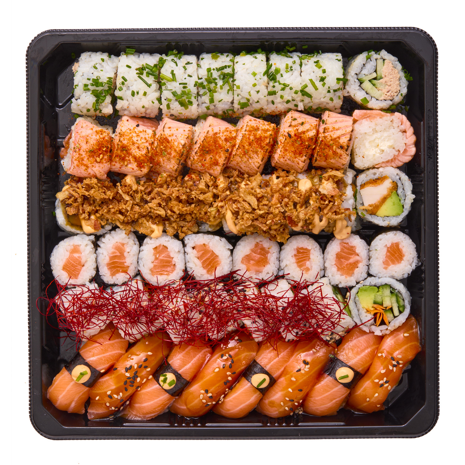 4 sushi saumon mayonnaise aromatisée à la truffe d'été, 4 sushi saumon laqué sésame, 8 california thon cuit mayonnaise ciboulette, 8 california végétarien filament de piment, 8 roll saumon fromage tobiko, 8 maki saumon, 8 california poulet pané mayonnaise oignons frits