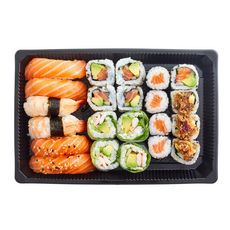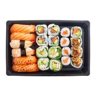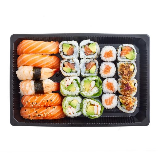 2 sushi saumon laqué sésame, 2 sushi saumon, 2 sushi crevette, 4 california saumon, 4 california saumon oignons frits, 4 cristal crevette panée, 4 maki saumon