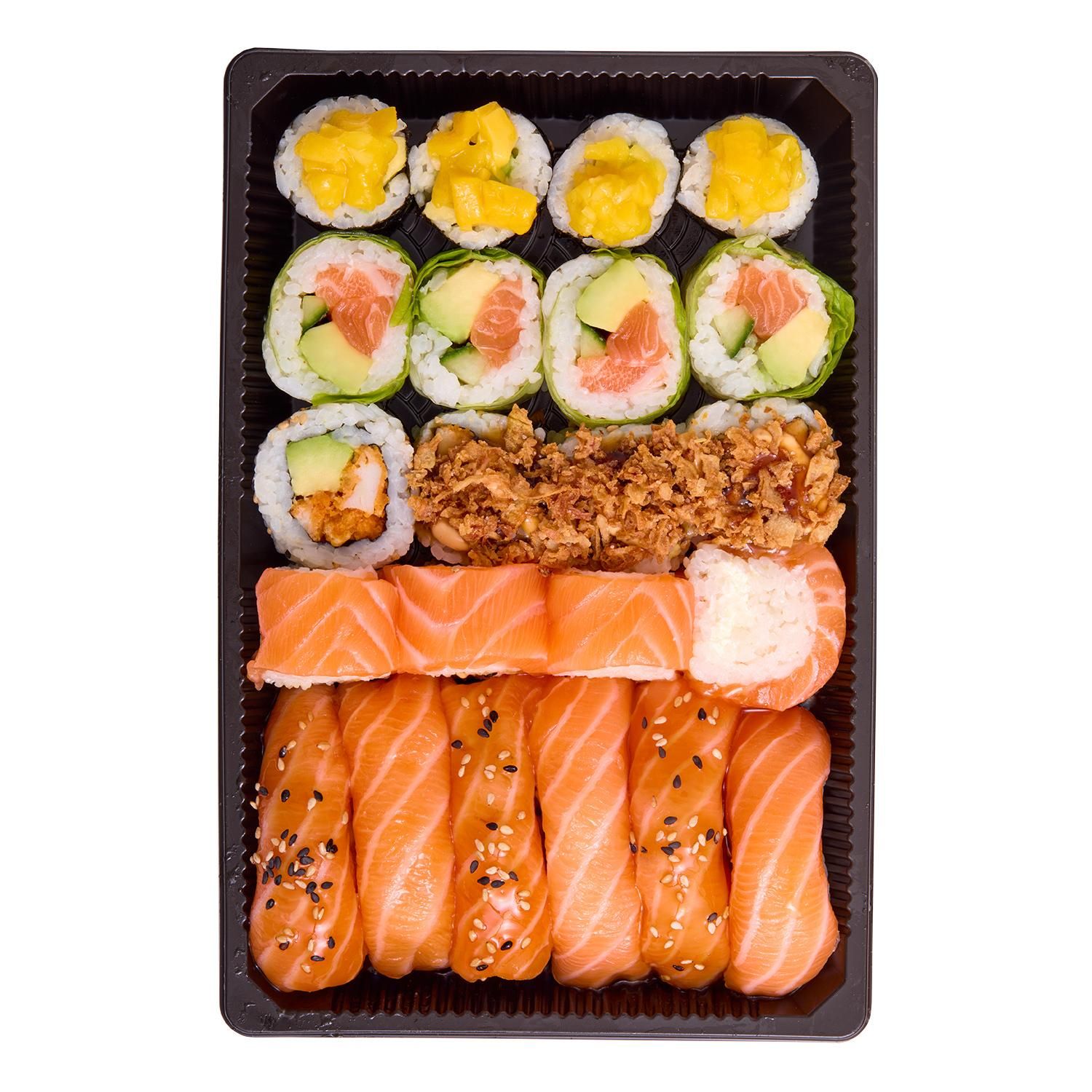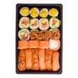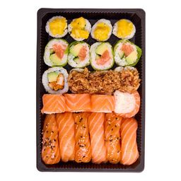 BOX PÂQUES : 3 sushi saumon laqué sésame, 3 sushi saumon, 4 cristal saumon, 4 california poulet pané oignons frits mayonnaise épicée, 4 roll saumon fromage, 4 maki mangue avocat