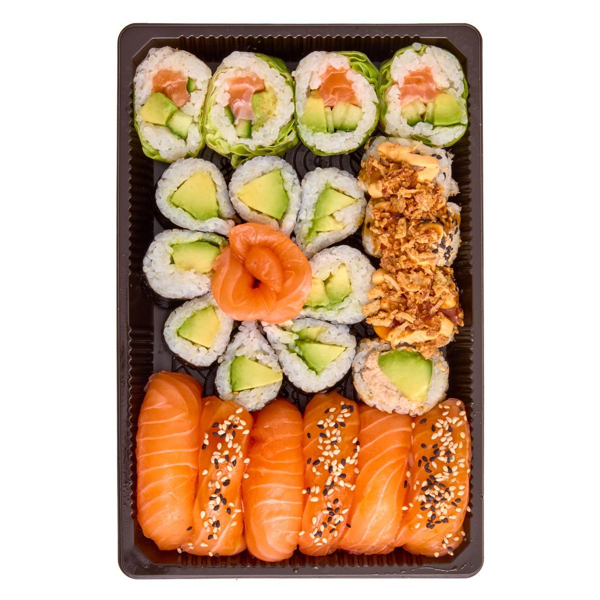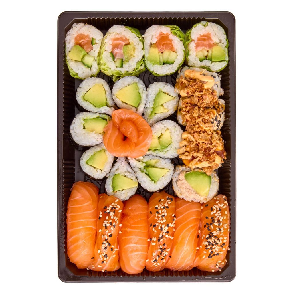 3 sushi saumon, 3 sushi saumon laqué sésame, 2 sashimi saumon, 4 cristal saumon, 8 maki avocat, 4 california thon cuit mayonnaise épicée oignons frits