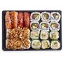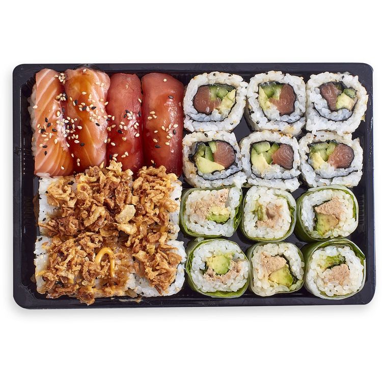 Ingrédients : riz vinaigré (riz, assaisonnement pour sushi (sucre, vinaigre d’alcool (préparé à partir d’alcool avec riz et lie de saké), vinaigre d’alcool, eau, sel), eau), avocat, #saumon# Atlantique 7%, #Thon# listao en morceaux au naturel 4%(#thon#, eau, sel), concombre, #thon# albacore 2%, mayonnaise 2% (Huile de colza, eau, jaune d’#ŒUF#, vinaigre, #MOUTARDE# (eau, graines de #MOUTARDE#, sel, vinaigre, curcuma), sel, dextrose, conservateur E202, stabilisateur E412, arôme), sauce SOJA sucrée épaisse (sauce #SOJA# (eau, #SOJA#, farine de #BLÉ#, sel), sucre, sirop de glucose- fructose, eau, amidon modifié, vinaigre, acidifiant : E270, épaississant : E415, conservateurs : E202, E211), galette de riz et tapioca (farine de riz, farine de tapioca,eau,sel), oignon frit (oignons 76%, huile végétale, #BLÉ#, eau, sel), mayonnaise épicée (Huile de colza, eau, pulpe de piment (piment, vinaigre, sel), MOUTARDE (eau, graines de #MOUTARDE#, vinaigre, sel), jaune d'#oeuf#, vinaigre, sucre, sel, amidon modifié ; épaississants E415, E412 ; ail, acidifiant E270, conservateur E202, piment de cayenne 0.1%, antioxydant E385), graines de #SÉSAME#, laitue, algue nori, menthe, coriandre