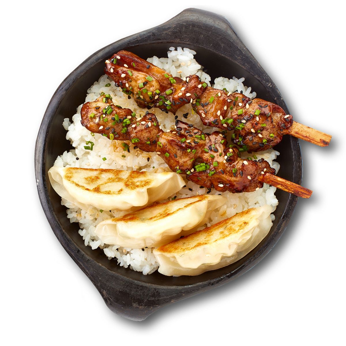 : 2 brochettes de poulet sauce soja sucrée décongelées et 3 raviolis aux légumes décongelés, sur riz vinaigré