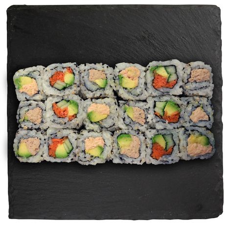 Ingrédients : riz vinaigré 59% (riz, assaisonnement pour sushi (sucre, vinaigre d’alcool (préparé à partir d’alcool avec riz et lie de saké), vinaigre d’alcool, eau, sel), eau), THON listao en morceaux au naturel (THON, eau, sel) 15%, et mayonnaise, mélange SAUMON 15% (SAUMON Atlantique cuit) et mayonnaise (huile de colza, eau, jaunes d’OEUF, vinaigre, MOUTARDE (eau, graines de MOUTARDE, sel, vinaigre, curcuma), sel, dextrose, conservateur E202, stabilisateur E412, arôme), mélange de légumes 10% (avocat, concombre, carotte), graine de SESAME