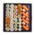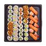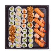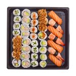 BOX MEGA PRIX FOU : 4 sushi saumon, 3 sushi crevette, 4 california végétarien oignons frits, 4 maki avocat, 4 maki fromage ciboulette, 4 maki thon cuit mayonnaise shishimi, 8 california thon cuit mayonnaise, 4 maki concombre, 4 california surimi oignons frits