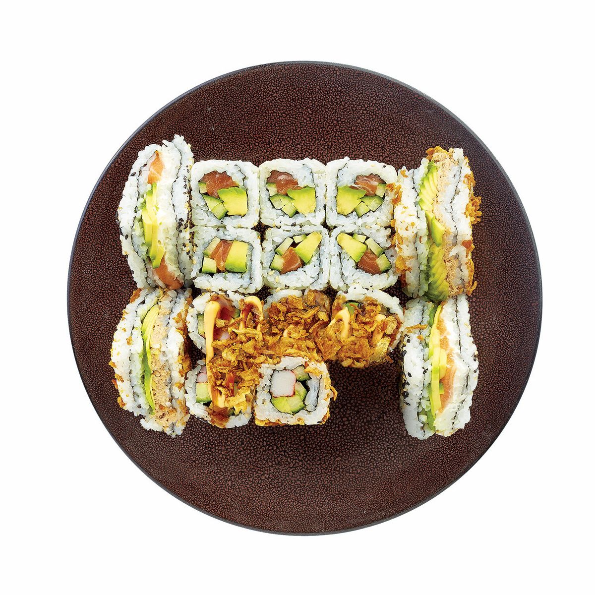 PLATEAU TSUKI: 2 rice sandwich saumon, 4 rice sandwich thon mayonnaise, 6 california saumon, 4 california oignon frits surimi