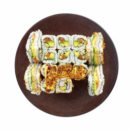 riz vinaigré 63% (riz, assaisonnement pour sushi (sucre, vinaigre d’alcool (préparé à partir d’alcool avec riz et lie de saké), vinaigre d’alcool, eau, sel), eau), avocat 12.5%, #saumon# Atlantique 7%, concombre 5.9%, #Thon# listao en morceaux au naturel 1.8% (#thon#, eau, sel), #surimi# aromatisé au #crabe# 1.7% (contient #SOJA#, #crustacés#) (chair de #poisson#, stabilisant: Sorbitols, Diphosphates, Triphosphates, eau, amidon de pomme de terre, sucre, sel, huile de colza, amidon modifié, blanc d'#oeuf# en poudre (blanc d'#oeuf#, correcteur d'acidité: Acide citrique, levure), exhausteur de goût: Inosinate disodique, 5'-ribonucléotide disodique, colorant: Carmins, Extrait de paprika, amidon de #blé#), oignon frit (oignons 76%, huile végétale, #blé#, eau, sel), mayonnaise (Huile de colza, eau, jaune d’#œuf#, vinaigre, #moutarde# (eau, graines de #moutarde#, sel, vinaigre, curcuma), sel, dextrose, conservateur: Sorbate de potassium, stabilisateur Gomme guar, arôme), mayonnaise épicée (Huile de colza, eau, pulpe de piment (piment, vinaigre, sel), moutarde (eau, graines de #moutarde#, vinaigre, sel), jaune d'#oeuf#, vinaigre, sucre, sel, amidon modifié ; épaississants: Gomme xanthane, Gomme guar ; ail, acidifiant: Acide lactique, conservateur: Sorbate de potassium, piment de cayenne 0.1%, antioxydant: Éthylène-diamine-tétra-acétate de calcium disodium), Sauce #SOJA# sucrée épaisse (Sucre 43%, sauce #SOJA# sans GLUTEN allégée en sel 35% (eau, graines de #SOJA#, sel, vinaigre), eau, amidon modifié, vinaigre d'alcool, acidifiant : acide lactique, épaississant : gomme xanthane, conservateur : sorbate de potassium)#fromage# à la crème (babeurre, crème (#LAIT#) pasteurisée, protéines de #LAIT#, acidifiant: Acide citrique, sel, épaississant: Farine de graines de caroube, conservateur: Sorbate de potassium), graines de #sésame#, algue nori,