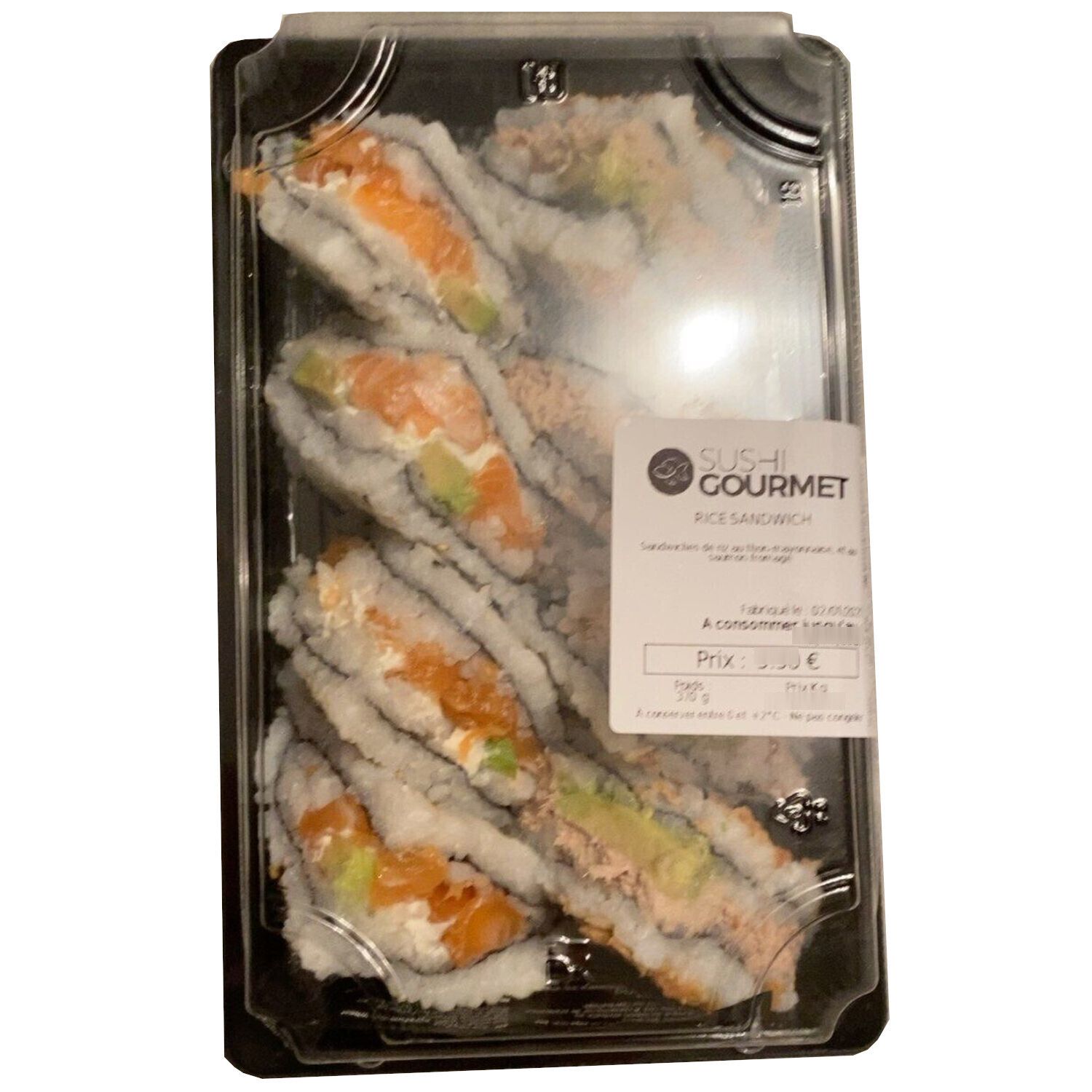 Ingrédients : riz vinaigré 78% (riz, assaisonnement pour sushi (sucre, vinaigre d’alcool (préparé à partir d’alcool avec riz et lie de saké), vinaigre d’alcool, eau, sel), eau), avocat, thon mayonnaise 8% (THON listao en morceaux au naturel (THON, eau, sel), mayonnaise (huile de colza, eau, jaunes d’OEUF, vinaigre, MOUTARDE (eau, graines de MOUTARDE, sel, vinaigre, curcuma), sel, dextrose, conservateur E202, stabilisateur E412, arôme)), SAUMON Atlantique 5%, FROMAGE à la crème 1,5% (Babeurre, CREME pasteurisée, (12,2%), protéines de LAIT acidifiant :E330, sel, épaississant : E410, conservateur : E202), oignon frit (oignons 76%, huile végétale, BLE, eau, sel), feuille d'algue nori, GRAINE DE SESAME.