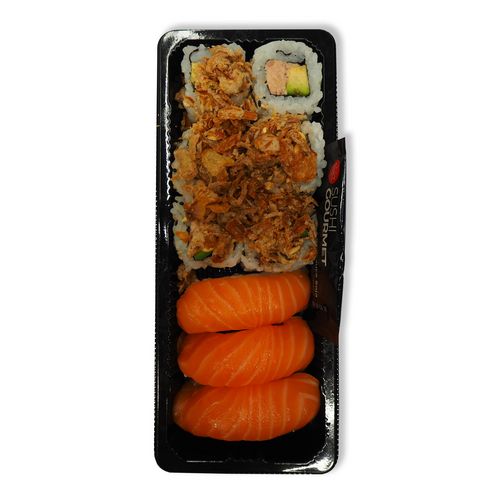 Snack crunch duo : 2 sushi saumon, 8 california thon cuit mayonnaise oignons frits