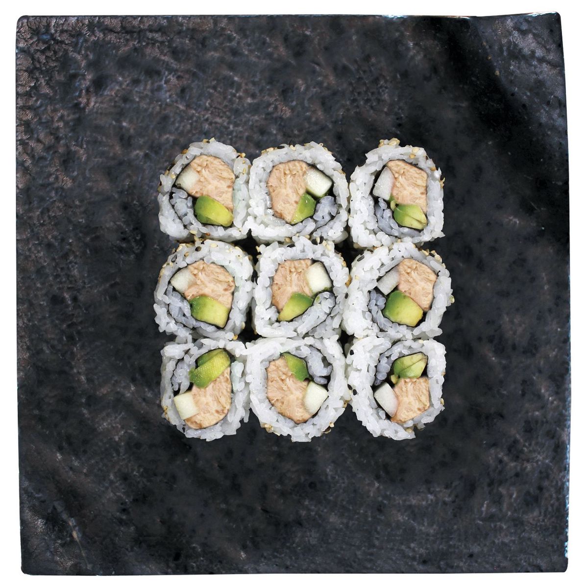 riz vinaigré 66% (vinaigre de riz (sucre, vinaigre, eau, sel, sirop de fructose, mélasse de canne), eau), #Thon# au naturel précuit 30% (#thon# Obèse ou Listao, eau, sel) et mayonnaise(Huile de colza (79.2 %), eau, jaunes d’#œufs# (6.1 %),vinaigre, #moutarde# (eau, graines de #moutarde#, sel, vinaigre, curcuma), sel, dextrose, conservateur : sorbate de potassium, stabilisateur : E412, arôme), algue nori, avocat, graine de #sésame#, mélange de 7 épices (piment, ecorce de mandarine,#sésame# blanc, #sésame# noir, sel), Spicy mayonnaise (huile de colza, eau, pulpe de piment 6% (piment, vinaigre, sel), #moutarde# (eau, graines de #moutarde#, vinaigre, sel), jaune d'#oeuf#, vinaigre, sucre, sel), amidon modifié, épaississants : E415, E412), ail, acidifiant : E270, conservateur : E202, piment de cayenne 0,1%, antioxydant : E385)
