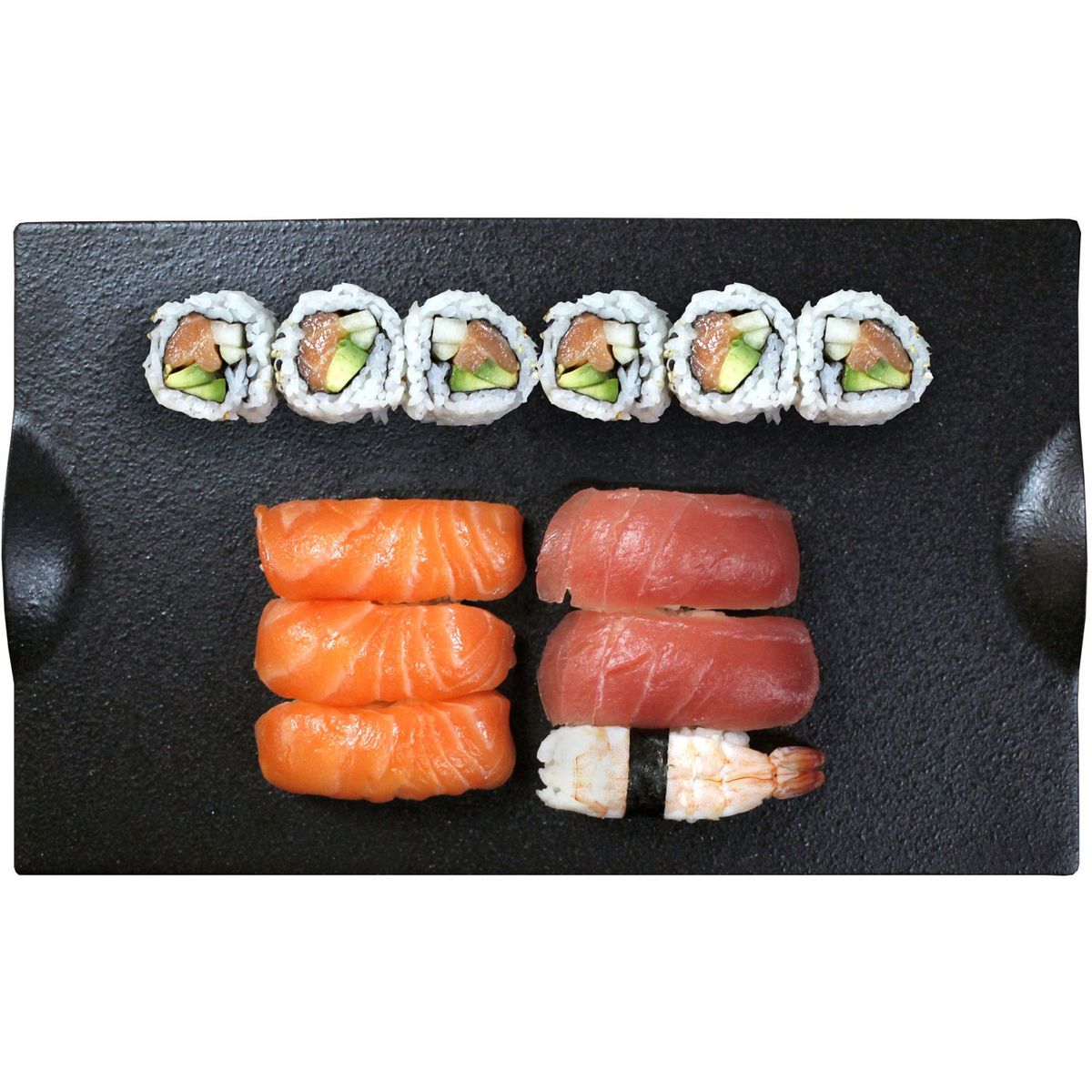 Ingrédients : riz vinaigré 68% (riz, assaisonnement pour sushi (sucre, vinaigre d’alcool (préparé à partir d’alcool avec riz et lie de saké), vinaigre d’alcool, eau, sel), eau), SAUMON Atlantique 19%, THON albacore 6%, CREVETTE ebi 3% (Litopenaeus vannamei 99,5%, sel), avocat, concombre, feuille d'algue nori, graine de SESAME