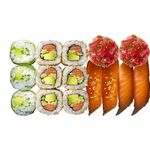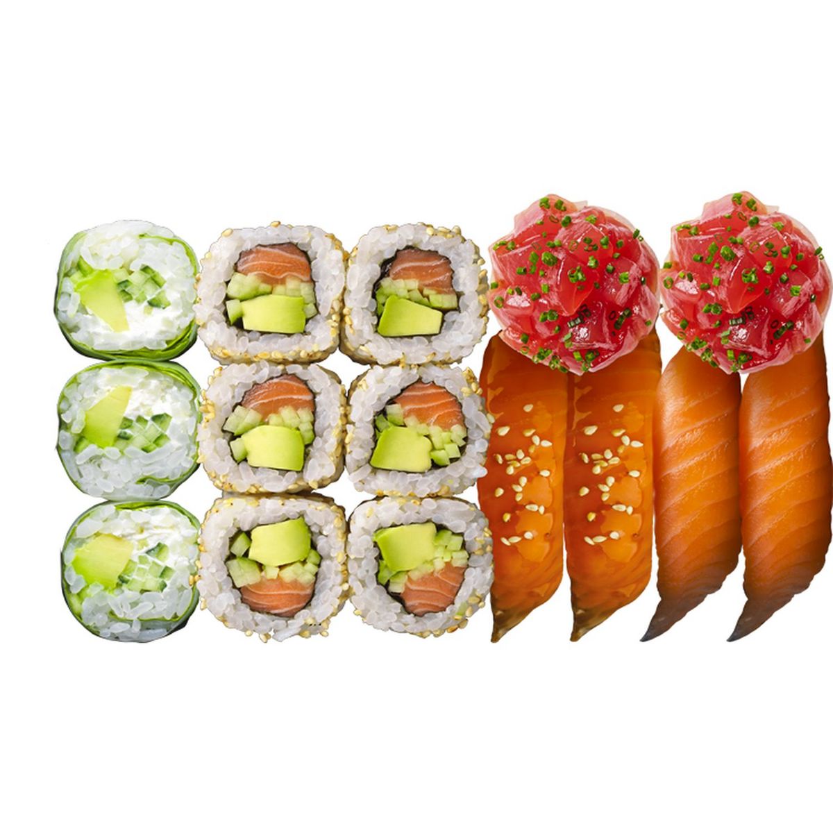 Christmas box 15p (california saumon avocat concombre (riz vinaigre*, 19% SAUMON Salmo salar (POISSON) (origine Ecosse/Norvège/Irlande/Iles Féroé), 11% concombre, 8% avocat, SESAME, feuilles d'algue (algue séchée (Porphyra Yezoensis))), Tulipe thon tartare (riz vinaigré (riz vinaigré (riz cuit, vinaigre de riz (vinaigre d’alcool (riz, lie de saké, alcool (traces résiduelles)), sucre, sel, eau, mélasse de canne)), SESAME), base thon tartare (THON (POISSON) (Thunnus obesus/Thunnus albacares) (origine océan Pacifique FAO 71/77 ou 77/87), huile de SESAME, sauce soja (eau, graines de SOJA dégraissées, BLE (GLUTEN), sel, alcool)), navet, ciboulette), sushi saumon teriyaki (riz vinaigre*, 30% SAUMON Salmo salar (POISSON) (origine Ecosse/Norvège/Irlande/Iles Féroé), 11% sauce teriyaki (sauce SOJA (eau, graines de SOJA, BLE (GLUTEN), sel), sucre, eau, amidon de maïs, purée d'oignon, vinaigre d'alcool, concentré de jus de pomme, poudre d'ail, concentré de jus de citron)), sushi saumon (riz vinaigre*, 33% SAUMON Salmo salar (POISSON) (origine Ecosse/Norvège/Irlande/Iles Féroé)), spring veggie (riz vinaigre*, concombre, fromage naturel au sel de Guérande (babeurre (LAIT), CREME (LAIT), LAIT écrème, sel de Guérande (1,1%), babeurre déshydrate (LAIT), protéines de LAIT, ferments lactiques (LAIT) , avocat, laitue, feuilles de riz ( farine de tapioca, farine de riz, eau, sel)))