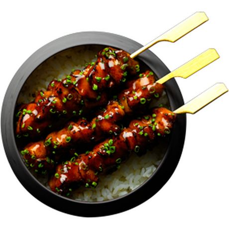 Brochettes yakitori (riz vinaigré (riz cuit, vinaigre de riz (vinaigre d’alcool (riz, lie de saké, alcool (traces résiduelles)), sucre, sel, eau, mélasse de canne)), 17% brochette de poulet mariné cuite surgelée (Viande de cuisse de poulet 81% (Thaïlande), sauce SOJA sucrée (sauce SOJA (eau, graine de SOJA, farine de BLE (GLUTEN), sel), eau, sel, sucre), sucre brun, sirop de glucose-fructose, régulateur d'acidité : E500ii, amidon de pomme de terre, acidifiant : E270, maltodextrine, acidifiant : E331, huile de palme (RSPO)), sauce teriyaki (sauce SOJA (eau, graines de SOJA, BLE (GLUTEN), sel), sucre, eau, amidon de maïs, purée d'oignon, vinaigre d'alcool, concentré de jus de pomme, poudre d'ail, concentré de jus de citron), ciboulette)