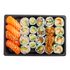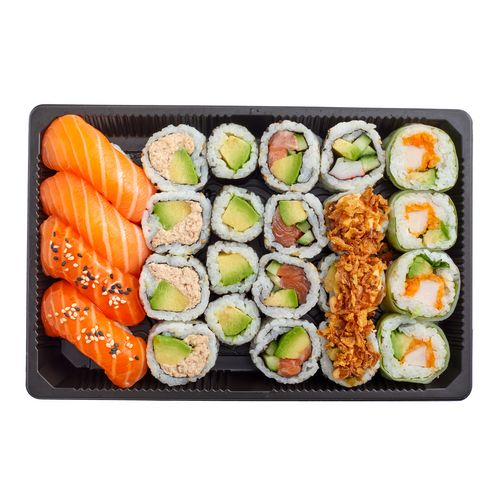 BOX INTERNATIONAL SUSHI DAY: 2 sushi saumon laqué sésame, 2 sushi saumon, 4 california saumon, 4 cristal poulet pané, 4 california thon cuit mayonnaise, 4 california oignon frit surimi, 4 maki avocat