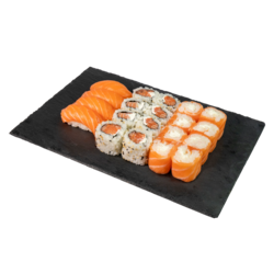 20 pièces - 4 sushis saumon , 8 ice rolls saumon cheese, 8 californias saumon cheese