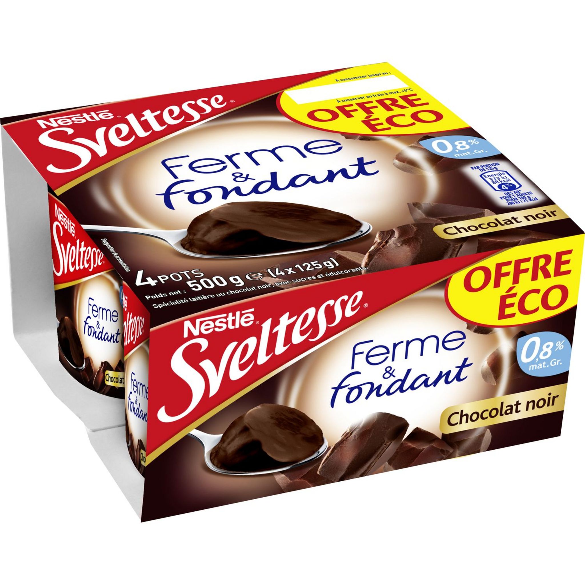 Spécialité laitière au chocolat noir, avec sucres et édulcorants.