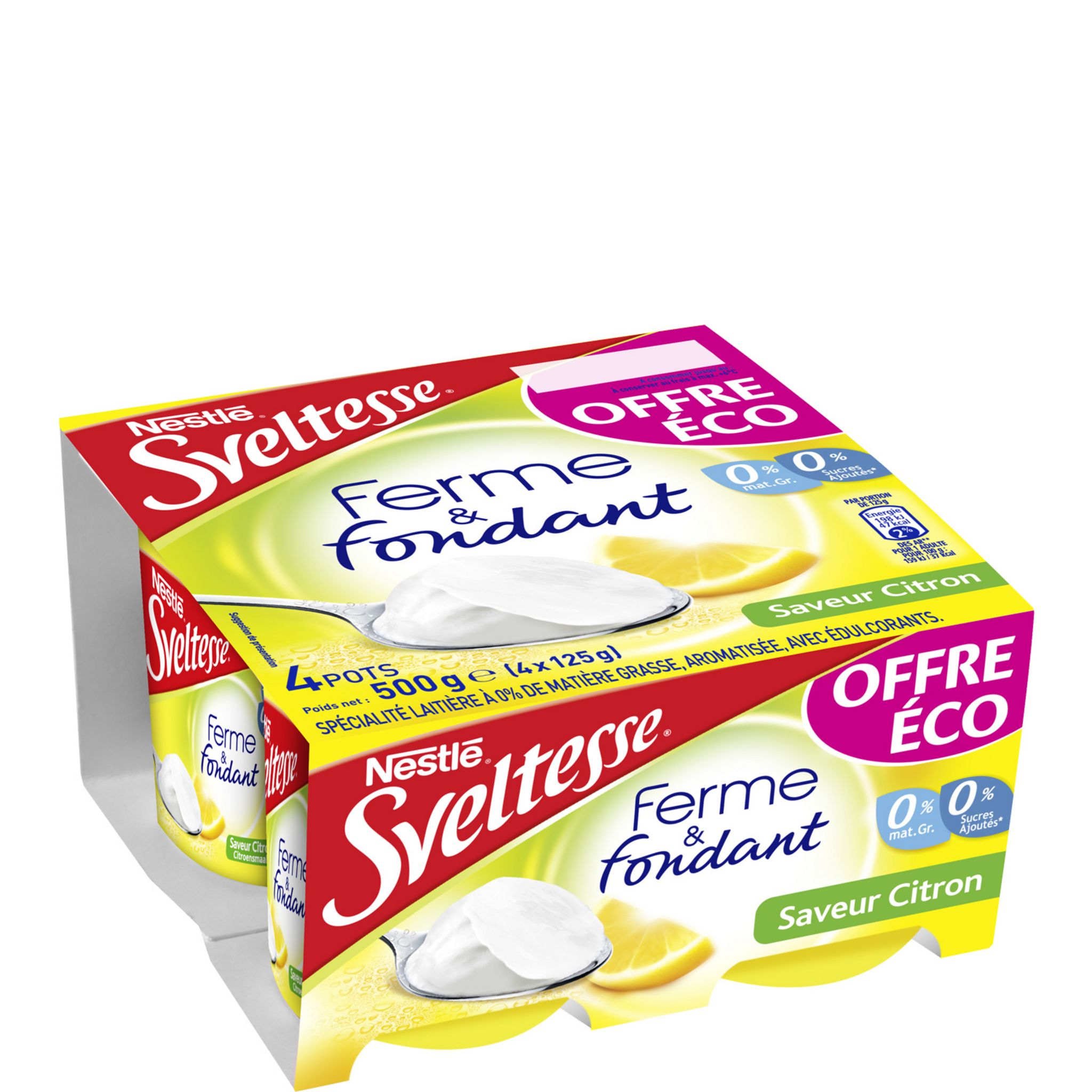Spécialité laitière à 0% de matière grasse, aromatisée citron, avec édulcorants. Ferme & Fondant de SVELTESSE pour unplaisir de sensations intenses en toutelégèreté.