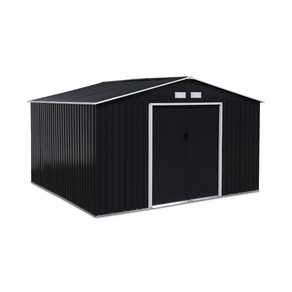 Abri de jardin en métal - Boulonnais - 10.85m² gris anthracite et blanc - Cabane à outils avec deux portes coulissantes. kit de fixation sol inclus. maison de rangement. remise