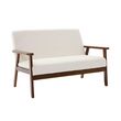 Banquette canapé 2 places en bois teinté noyer clair et tissu bouclette. Isak. L 114 x P 69.5 x H 73cm
