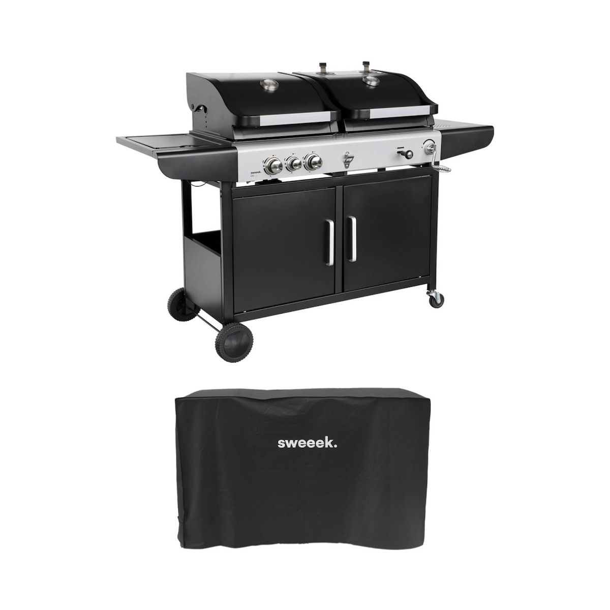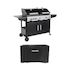 Barbecue 2 en 1 gaz et charbon. 3 brûleurs + 1 feu latéral. grill et fumoir avec tablettes et housse