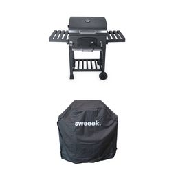 Barbecue Grill charbon de bois noir - Fumoir avec récupérateur de cendres. aérateurs. bac charbon ajustable et tablettes rabattables + Housse en PVC