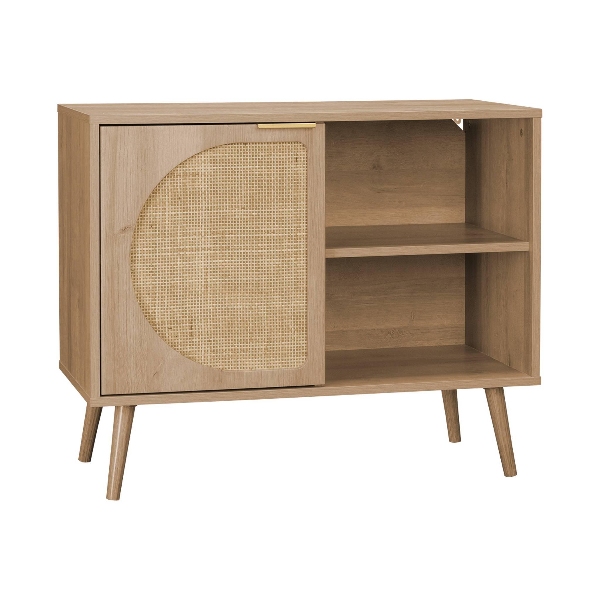 Buffet de rangement décor bois cannage arrondis. Eva. 1 portes réversible. deux niveaux. buffet bas. L80 x l39 x H65.8cm