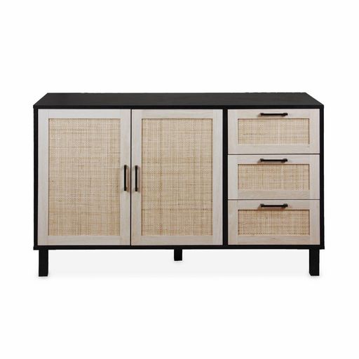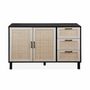 Buffet noir et cannage 120 x 40 x 75cm - Bianca - 3 tiroirs. 2 portes. 2 niveaux. 1 étagère. buffet bas