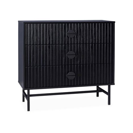 Les + produits :Bois rainuré3 tiroirsPoignées et pieds en métal noirStyle contemporainDécouvrez la commode BAZALT. Avec ses lignes délicates et son design épuré, elle transforme votre espace en un paradis de charme élégant. En noir, parce que le noir va avec tout ! Les détails en bois rainuré ajoute