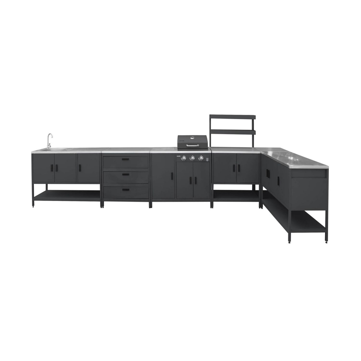 Pratique et bien pensé, le barbecue dispose de 3 portes et 2 rangements pour organiser ustensiles et bonbonne de gaz. Les modules complémentaires offrent un évier intégré, de grands plans de travail et de nombreux rangements : 5 portes, 3 tiroirs et 6 étagères, dont 2 suspendues.