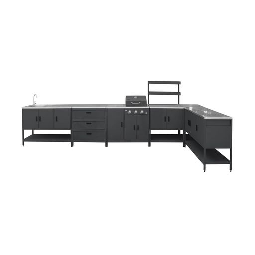 Créez une cuisine extérieure complète avec cet ensemble de 6 modules, incluant un barbecue à gaz au design élégant et fonctionnel. Avec ses 3 brûleurs en acier inoxydable, son thermomètre intégré et sa grande surface de cuisson, il permet de régaler jusqu'à 9 convives.
