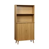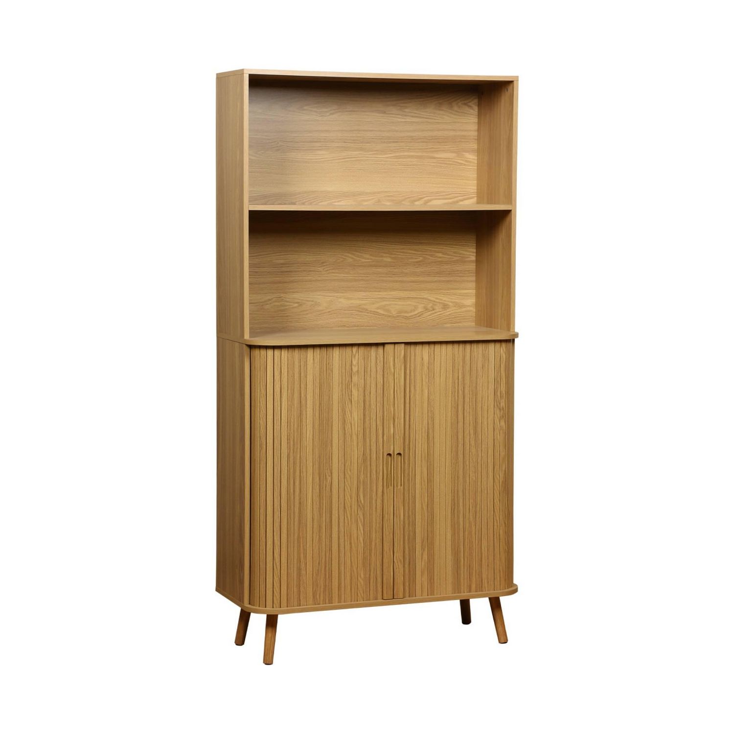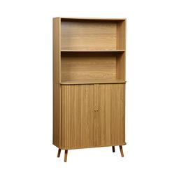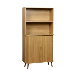 Dotée de deux portes coulissantes avec poignées creusées, cette bibliothèque en panneaux stratifiés arbore une finition effet bois rainuré qui ajoute chaleur et élégance à votre espace.