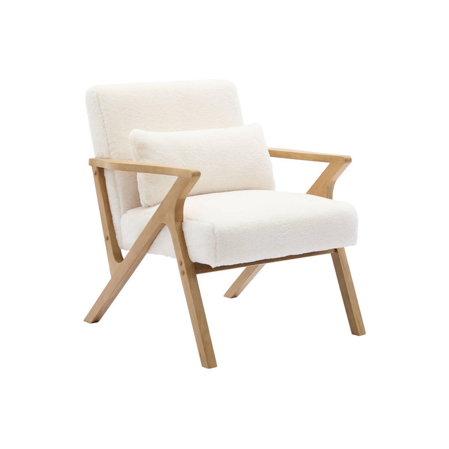 Fauteuil scandinave bois d'hévéa et tissu effet fausse fourrure blanc crème