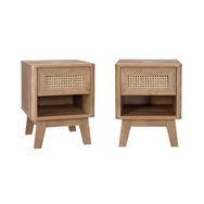 Lot de 2 tables de chevet avec 1 tiroir et 1 niche effet bois et cannage. pieds eucalyptus