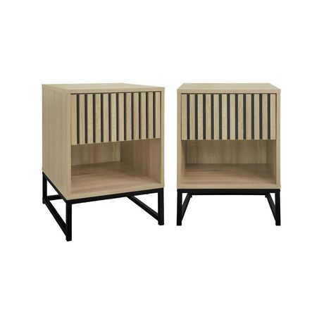 Les + produit : - Lot de 2 tables de chevet- 1 tiroir (système d'ouverture par pression) et 1 niche de rangement - Effet rainuré- Piétement métal noir Ces tables de chevet incarnent à la perfection le mariage entre modernité et praticité. Leur tiroir rainuré apporte une touche subtile de sophisticat