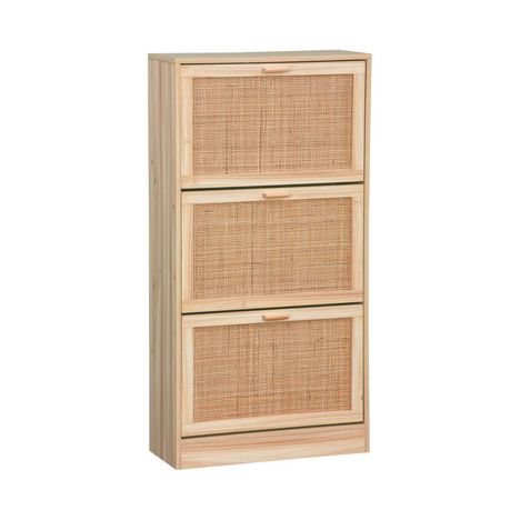 Les + produit Poignées en bois de sapinCapacité de rangement : 18 chaussures3 portes Notre meuble à chaussures en cannage constitue un ajout idéal à votre espace de vie en combinant élégance et praticité. Les trois portes revêtues délicatement de cannage apportent une note charmante, tandis que les