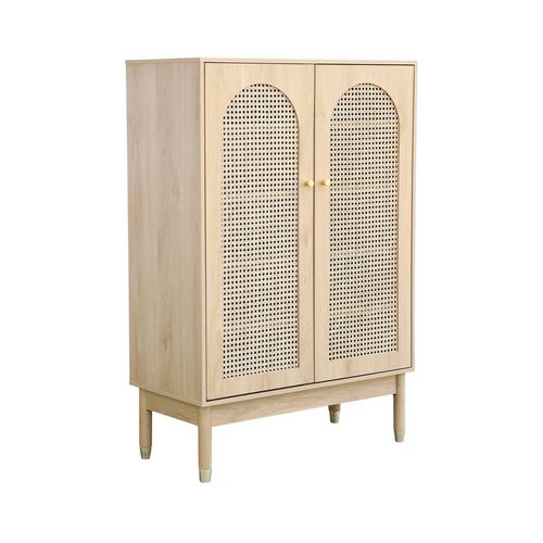 Meuble à chaussures / Petit buffet 2 portes cannage JUDITH. 20 paires de chaussures. 4 étagères. pieds en bois d'hévéa avec caps finition dorée.