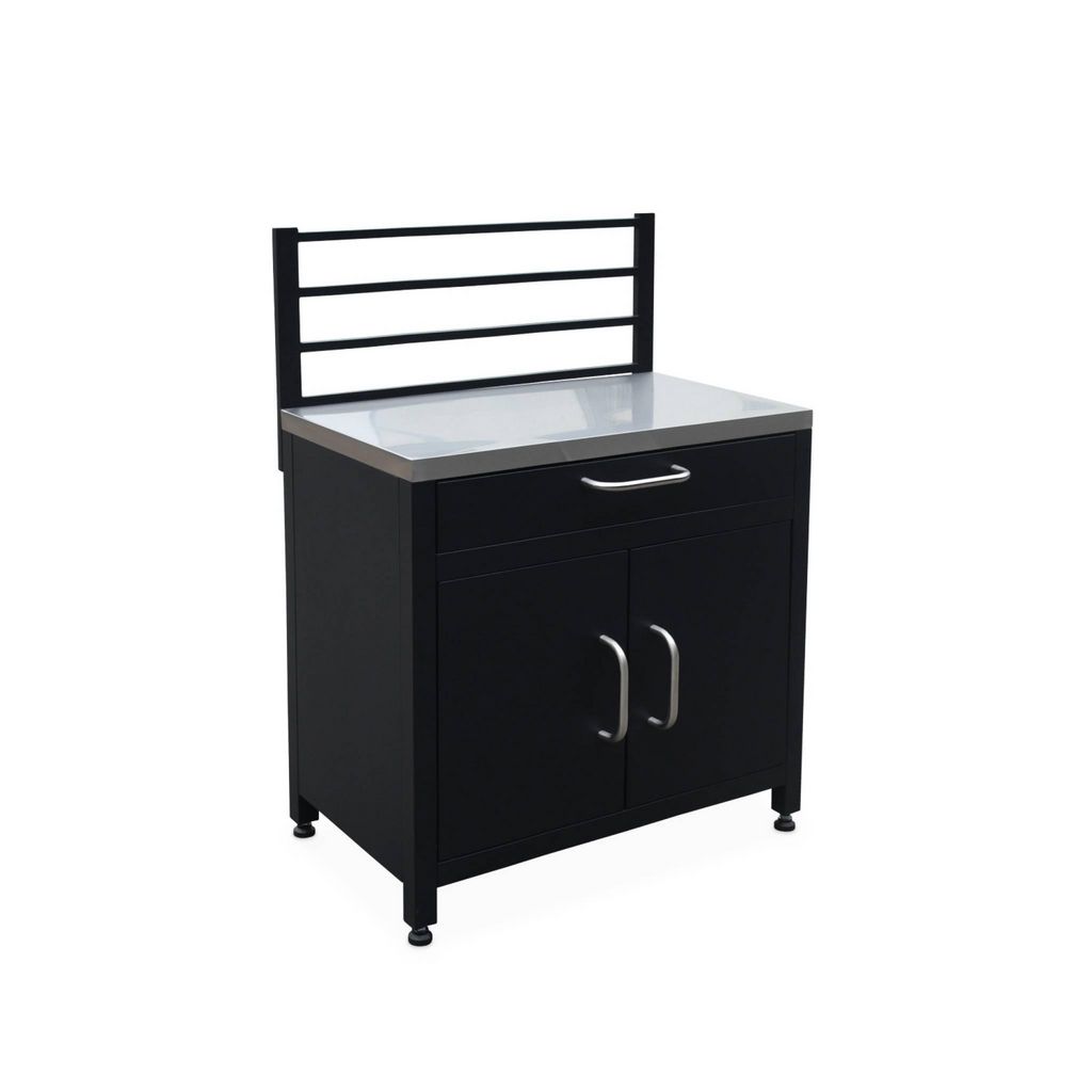 Ce meuble représente un choix idéal pour une cuisine extérieure à la fois pratique et élégante. Grâce à sa couleur noire et à son plateau en acier inoxydable, il offre un aspect intemporel et une robustesse adaptée à une utilisation en extérieur.