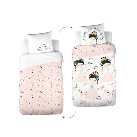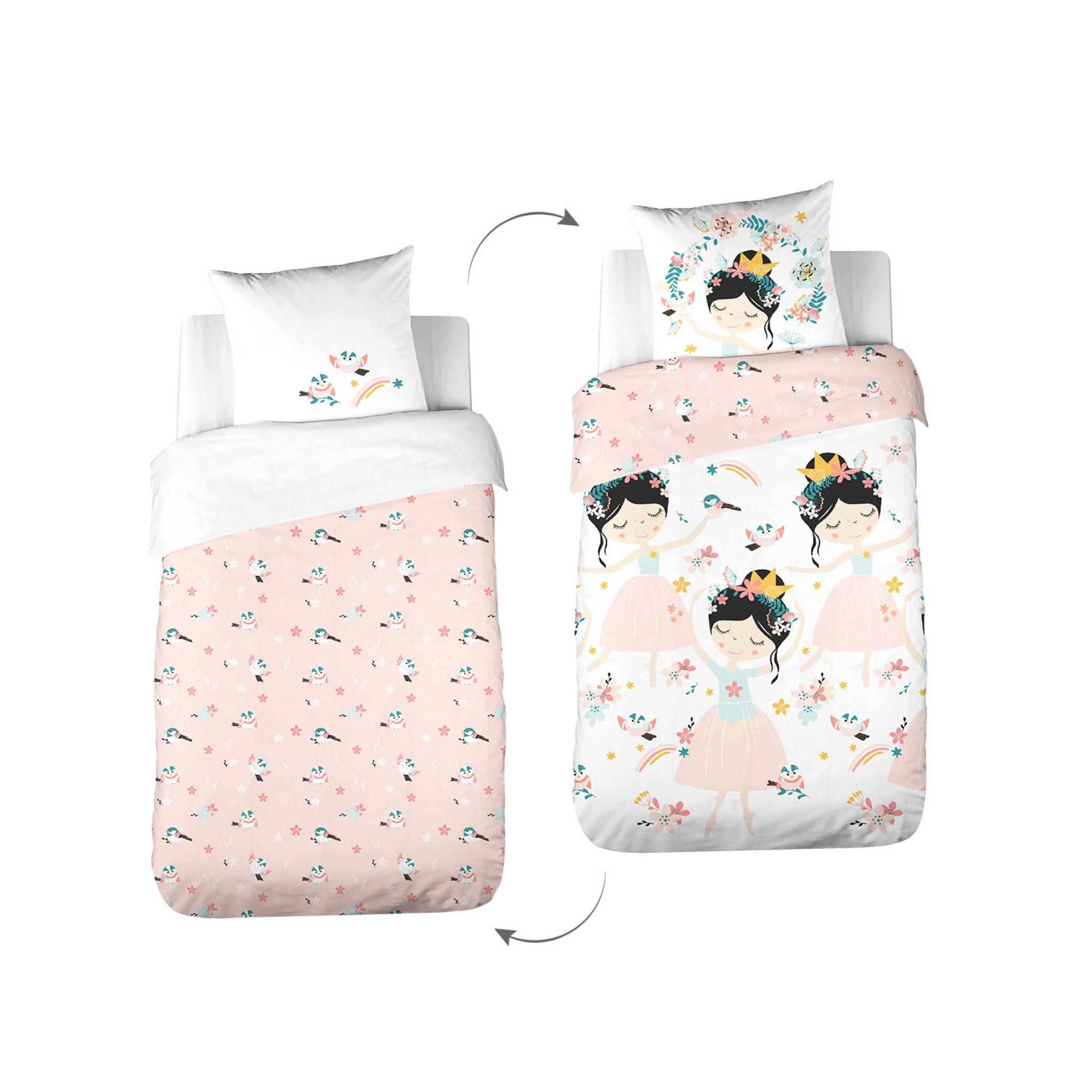Parure de lit réversible 1 place imprimé princesse et oiseaux en polycoton. 1 housse de couette et 1 oreiller