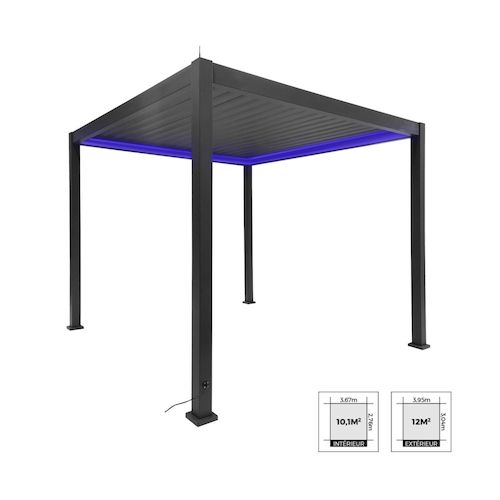 Cette pergola est équipée de LED intégrées tout autour de la structure. Grâce à la télécommande vous pourrez créer différentes ambiances en variant les intensités, les modes et les couleurs.