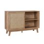 Petit buffet avec 1 porte coulissante et étagères. effet bois et détails cannage. buffet bas. 120cm