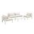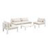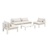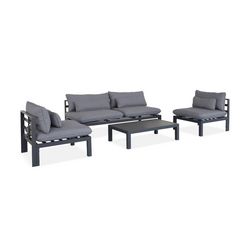 Ce salon est adapté à une utilisation extérieure. La structure en aluminium est légère et ne rouille pas. Les coussins en polyester ont une densité de 220g/m². Ils sont déhoussables. Le tissu tissé est résistant aux UV et déperlant.