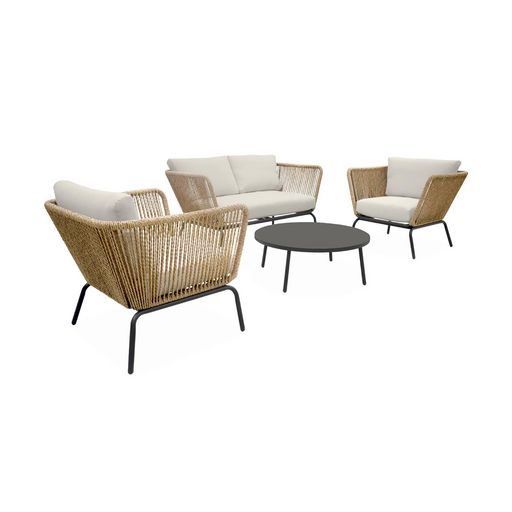 Salon de jardin bas Singapour, résine tressée effet corde, 4 places, coussins déhoussables