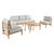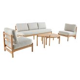 Salon de jardin COPACABANA 5 places en bois d'acacia. housse beige en lin. un banc. deux fauteuils. deux tables
