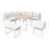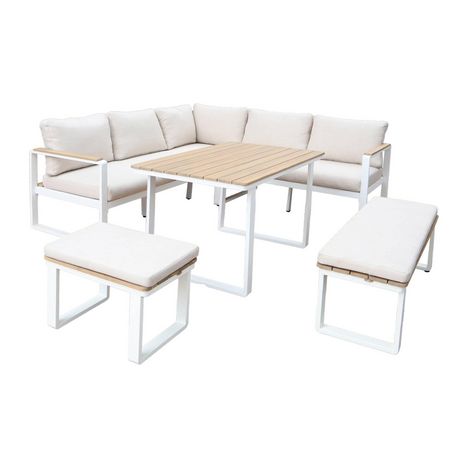 Vous souhaitez recevoir vos proches dans un salon de jardin aussi joli que confortable ? Découvrez le salon de jardin Pampas conçu en bois d'acacia et aluminium. Cette bi-matière assure robustesse et longévité et une facilité d'entretien. Les housses de coussin en polyester sont déhoussables et confortables pour passer de bons moments entre amis. L'ensemble comprend une table, un module 3 places, un module 2 places ainsi que deux bancs pouvant accueillir au total 8 personnes. C'est le salon de jardin idéal pour partager des repas tous ensemble.