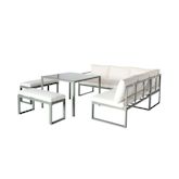 L'ensemble Convivio trouve naturellement sa place dans votre extérieur et devient vite le cœur des moments partagés. Vous profitez d'un ensemble repas accueillant, pensé pour recevoir famille et amis autour d'une grande table au plateau en verre sécurit, idéale pour les repas qui s'étirent ou les apéritifs improvisés. Les deux canapés, complétés par des bancs confortables, invitent à s'installer, discuter et se détendre, portés par des coussins beiges doux et déhoussables, faciles à entretenir au quotidien. La structure en aluminium kaki apporte une touche contemporaine tout en restant légère et résistante, parfaite pour un usage extérieur sans contrainte. Ce salon de jardin vous permet de créer un espace chaleureux où l'on aime se retrouver, savourer le calme, partager un café le matin ou prolonger les soirées d'été en toute simplicité.