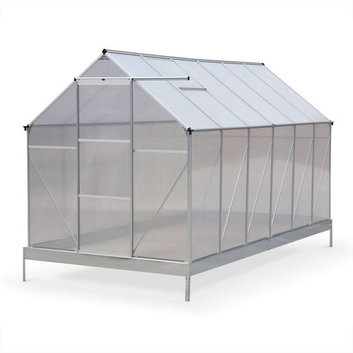 Serre de jardin Sapin en polycarbonate 7m² avec base. 2 lucarnes de toit. gouttière. Polycarbonate 4mm