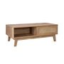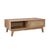 Table basse avec 2 niches. 1 porte coulissante. effet bois et cannage. pieds eucalyptus