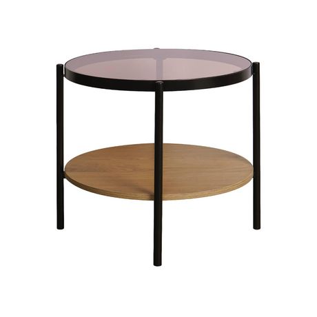 Table basse / d'appoint ronde 52 x 52 cm effet bois et métal noir. 2 plateaux dont un en verre trempé