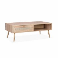 Table basse en cannage 110 x 59 x 39 cm - Bohème - Naturel. 1 tiroir. 1 espace de rangement. pieds scandinaves